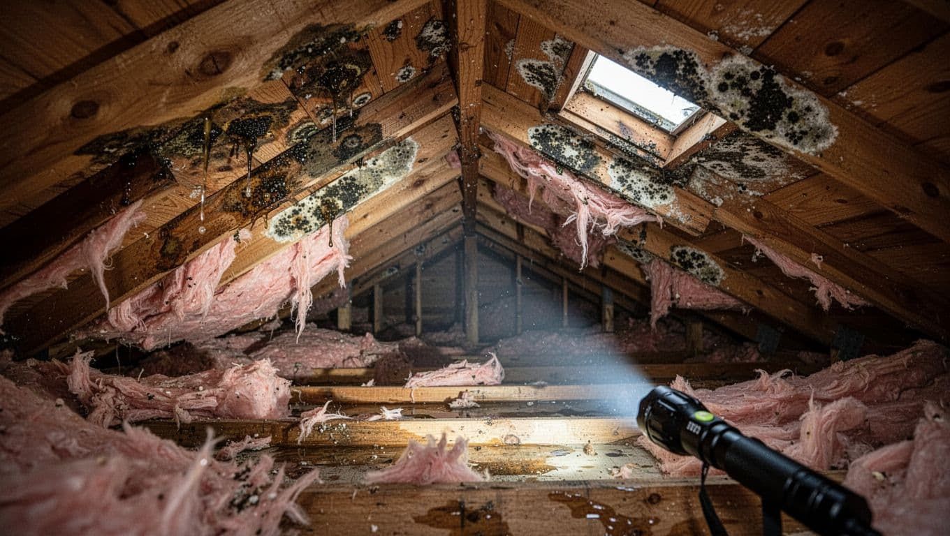 An attic leak can soak insulation and stain framing long before it shows up on a ceiling, created with AI.